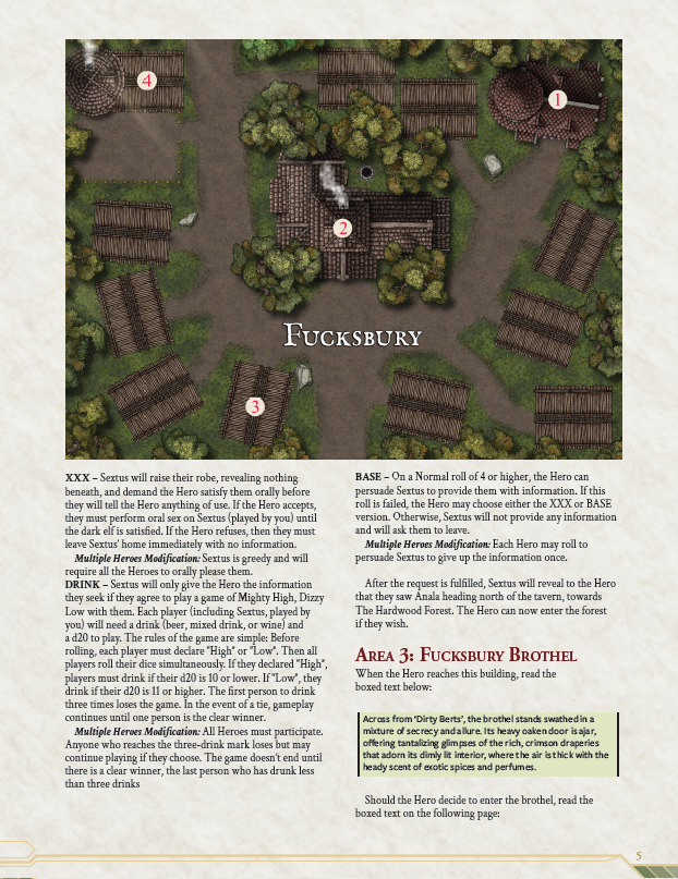 In this adventure, the Hero will have to investigate the village to find clues about the whereabouts of the missing woman, and information in The Unbound Domain does not come for free. This module has several NPCs to seduce, a drinking game, a brothel, and two Special Scenarios.